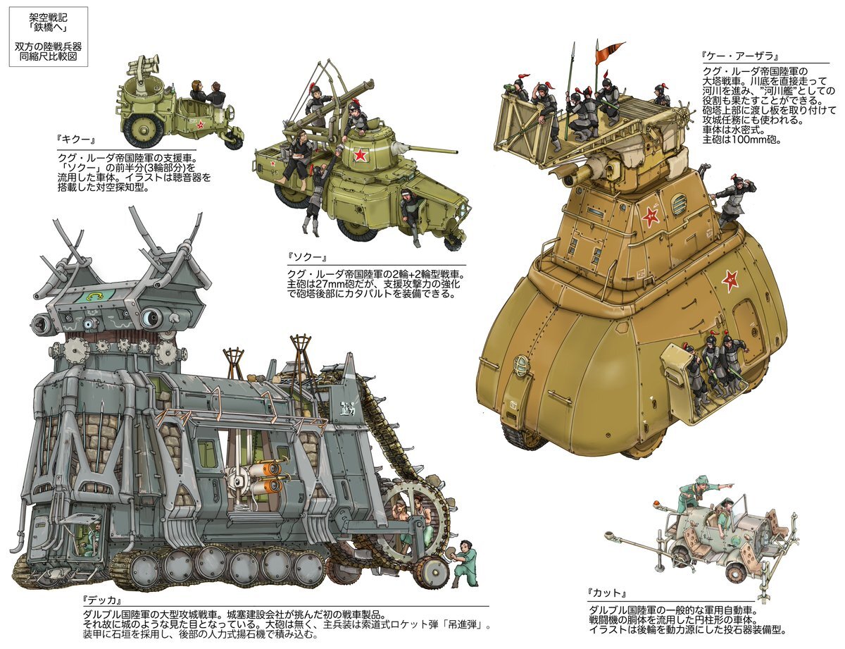 オリジナル架空兵器 「キクー(支援車)」 「ソクー(2輪+2輪型戦車)」 「ケー・アーザラ(大塔戦車)」 「カット(軍用自動車)」 「デッカ(大型攻城戦車)」 双方の主力陸戦兵器同縮尺比較図となります。 #架空兵器 #絵 #イラスト pic.x.com/CUlwRiqrQw
