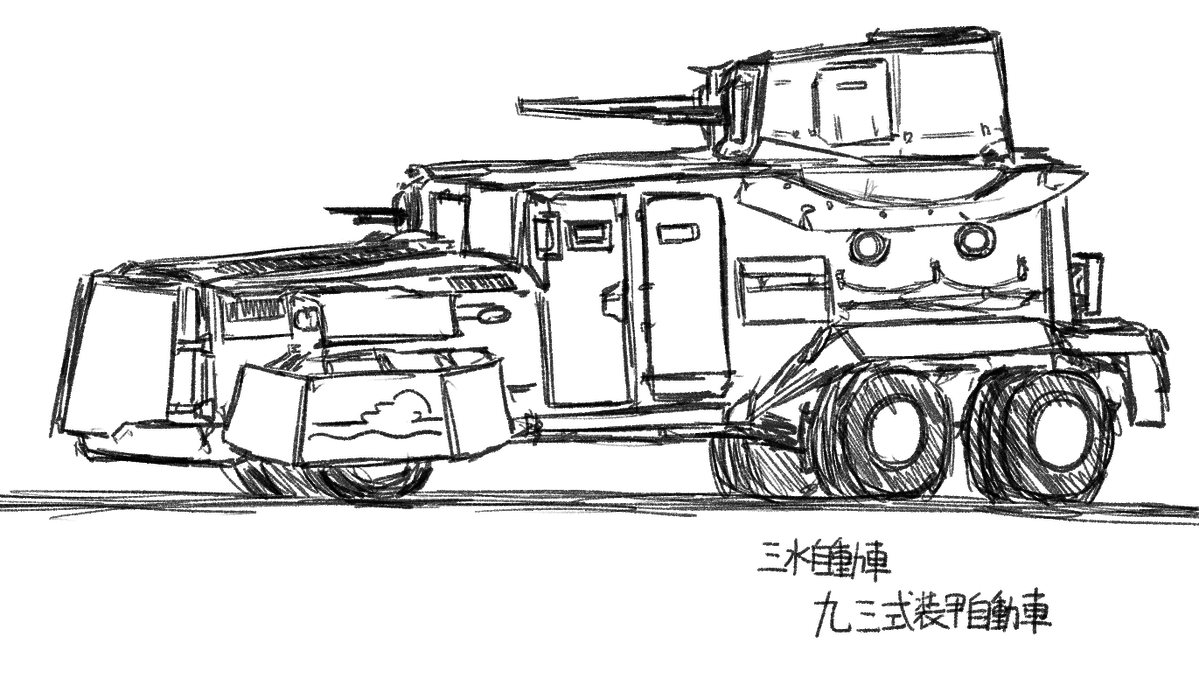 #Wakou_Koku #架空兵器 #イラスト 名称 九三式装甲自動車 所属 和光國陸軍[WA] 種別 装甲車(装甲戦闘車) 乗員 6名 主機 三水発動機 直列6気筒 主機冷却 水冷 最高速度 42km/h 砲塔旋回速度 不明 → pic.x.com/PAt0glBHt9