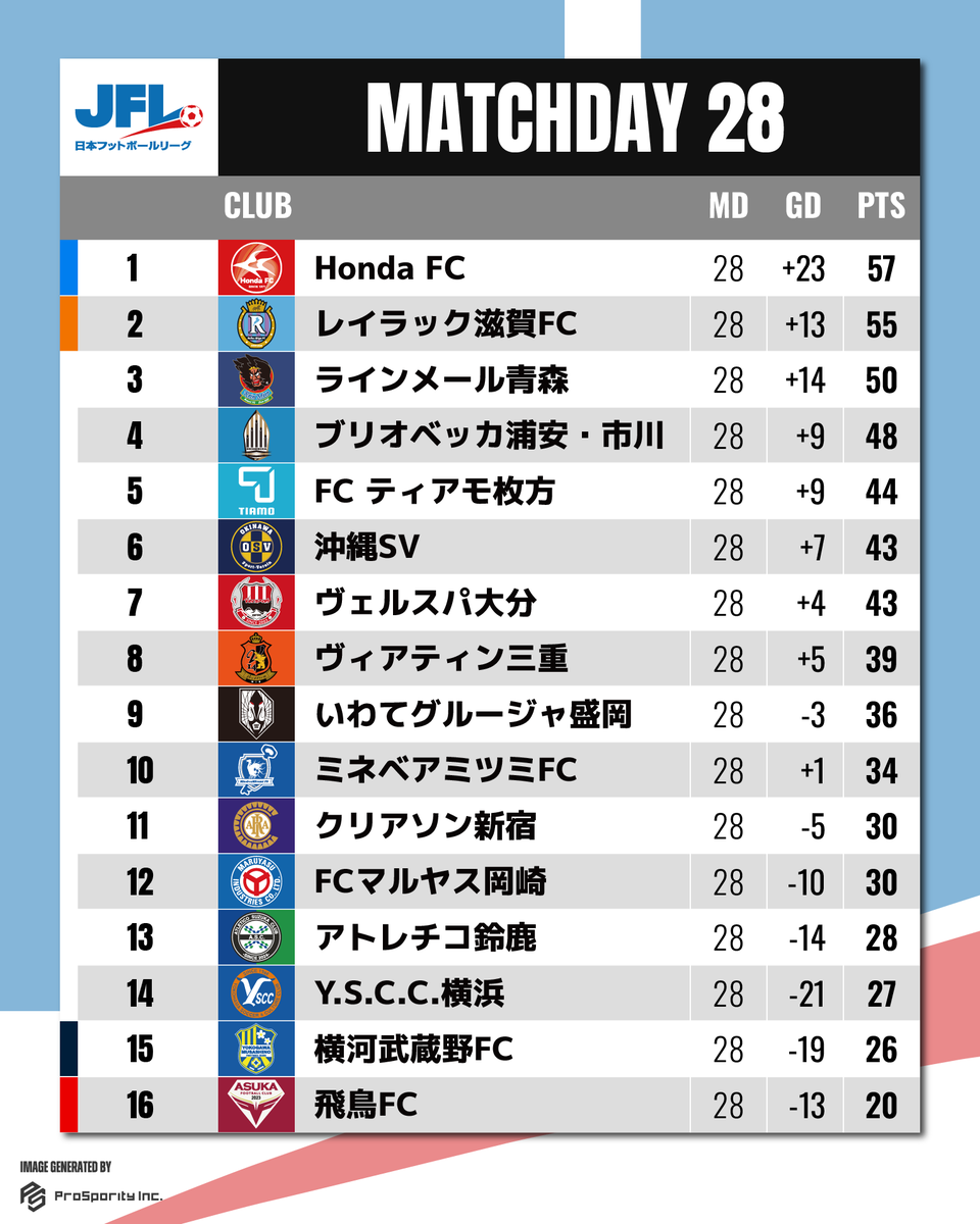 📊第28節を終えての順位表🏆 #レイラック滋賀 は引き続き2位! 次戦は4位・ブリオベッカ浦安・市川戦🔵🐱 残り2試合。逆転優勝へ、熾烈な争いが続きます。 熱い応援、何卒よろしくお願い致します!! 🏆#JFL 第29節 🗓2025/11/16 13:00 🆚#ブリオベッカ浦安・市川 🏟#柏の葉公園総合競技場 pic.x.com/7hTby3dLN3