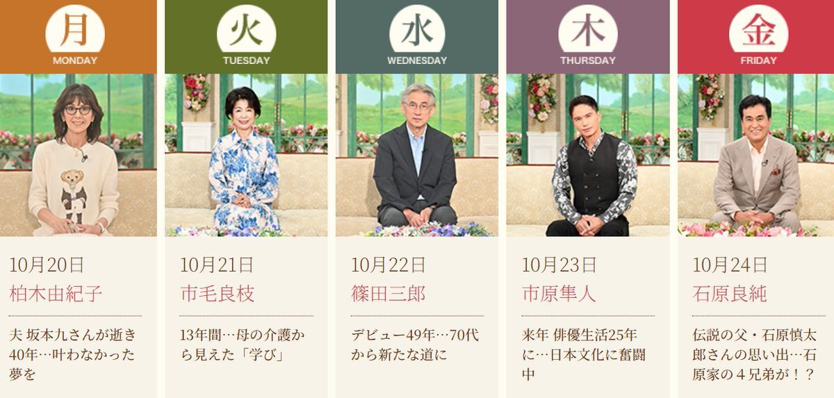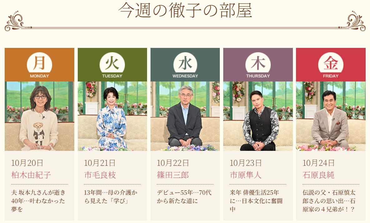 \来週の #徹子の部屋 💐/ 10月20日(月) #柏木由紀子 さん 10月21日(火) #市毛良枝 さん 10月22日(水) #篠田三郎 さん 10月23日(木) #市原隼人 さん 10月24日(金) #石原良純 さん ぜひご覧ください👀✨ pic.x.com/kAlkpByLEb