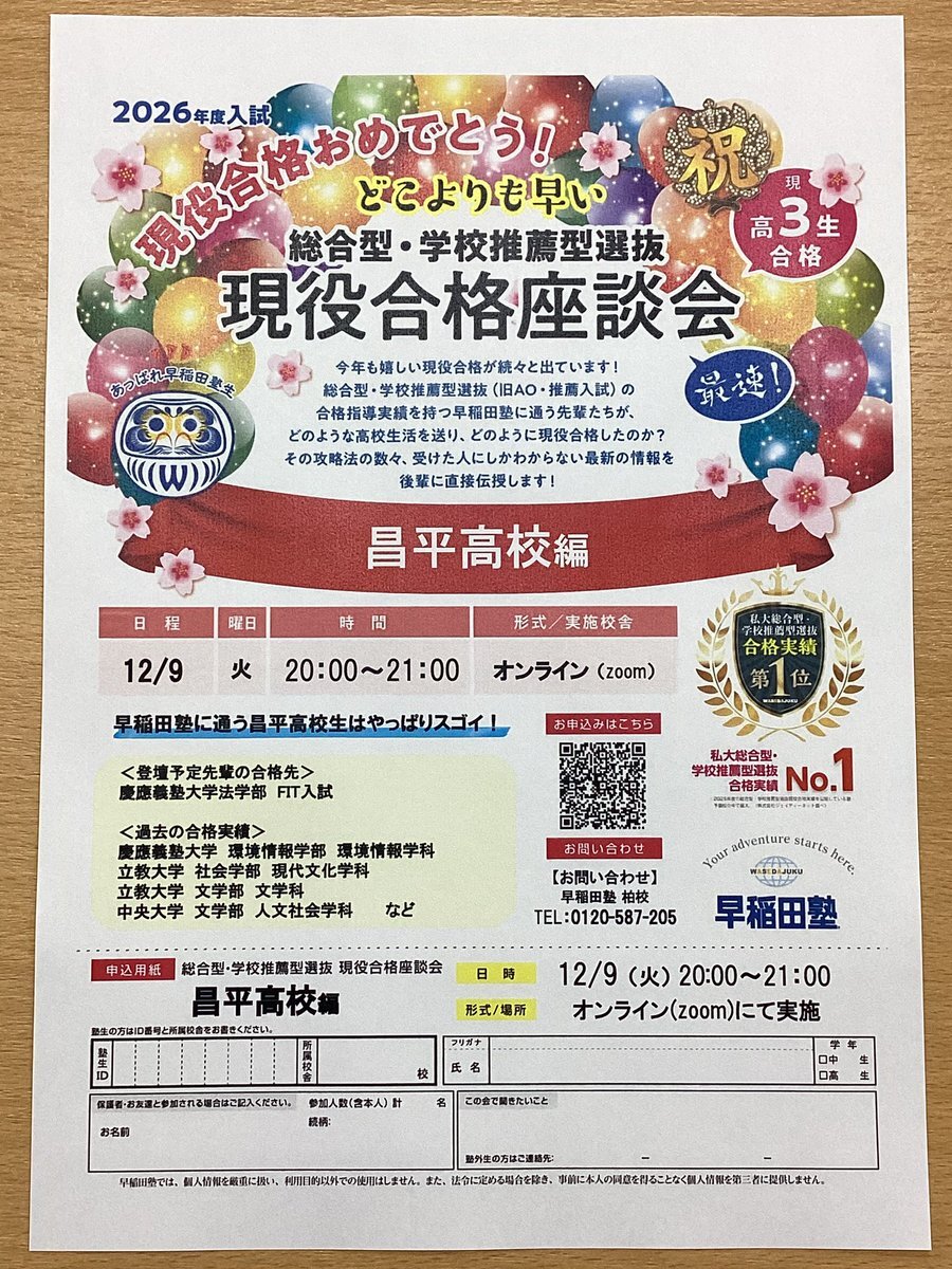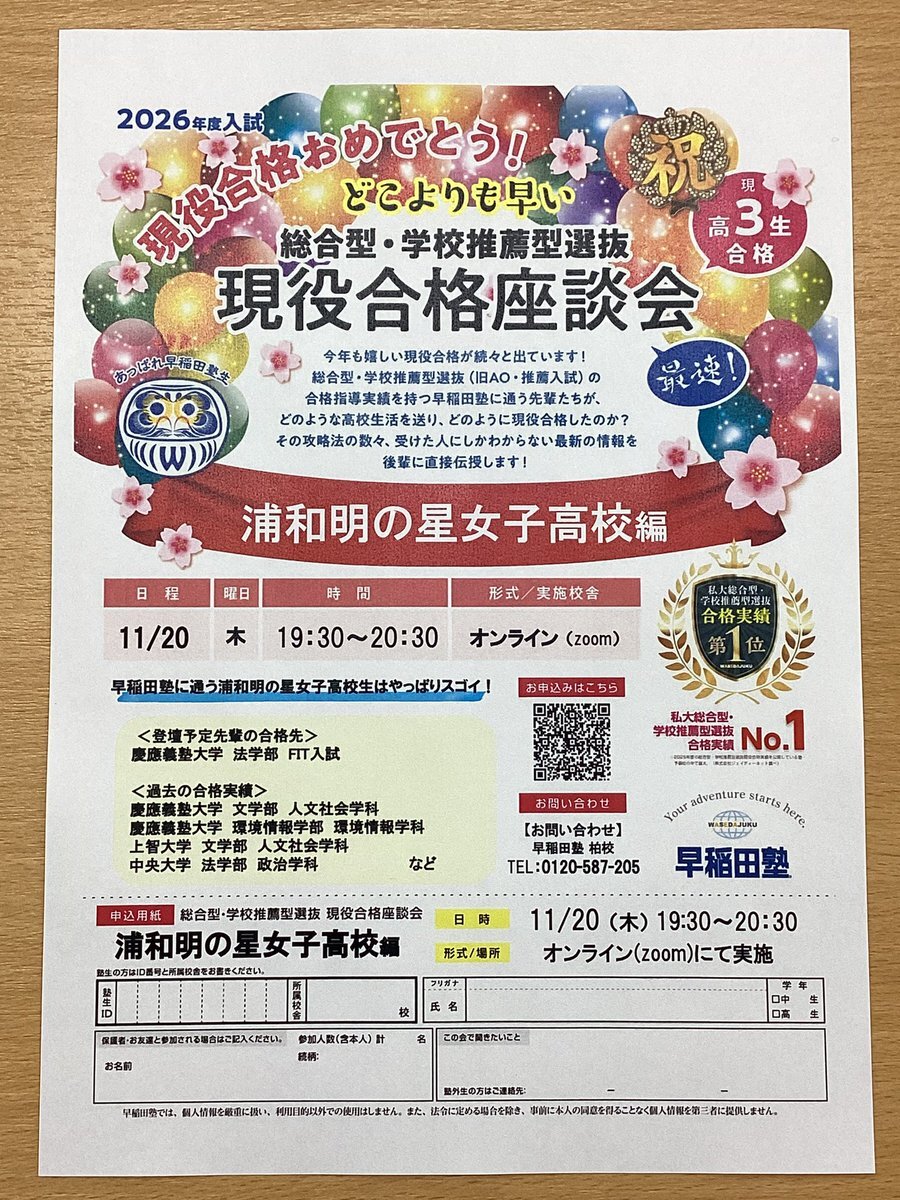 【㊗️現役合格企画💮】 「どこよりも早い!総合型・学校推薦型選抜現役合格座談会」 #浦和明の星女子高校 編が開催されます🔥 本年度合格者が登壇し、受験のリアルをみなさんに直接伝授します🌸 詳細は以下のパンフレットよりご確認ください! #早稲田塾柏校 #柏校 #総合型選抜 #入試 pic.x.com/7l5fCunQpE