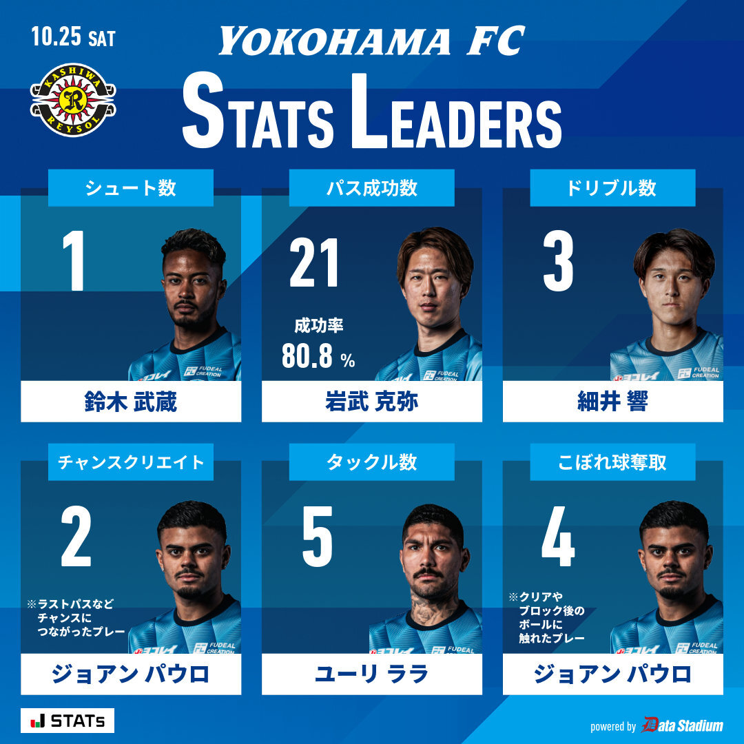 👑本日のスタッツリーダー シュート数: #鈴木武蔵 パス成功数: #岩武克弥 ドリブル数: #細井響 チャンスクリエイト: #ジョアンパウロ タックル数: #ユーリララ こぼれ球奪取: #ジョアンパウロ #yokohamafc #横浜FC #柏横浜FC pic.x.com/kHJ9ajIRRF