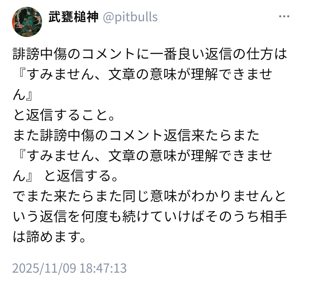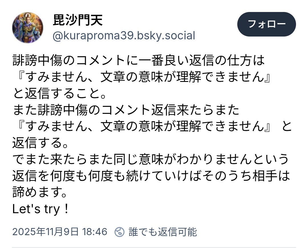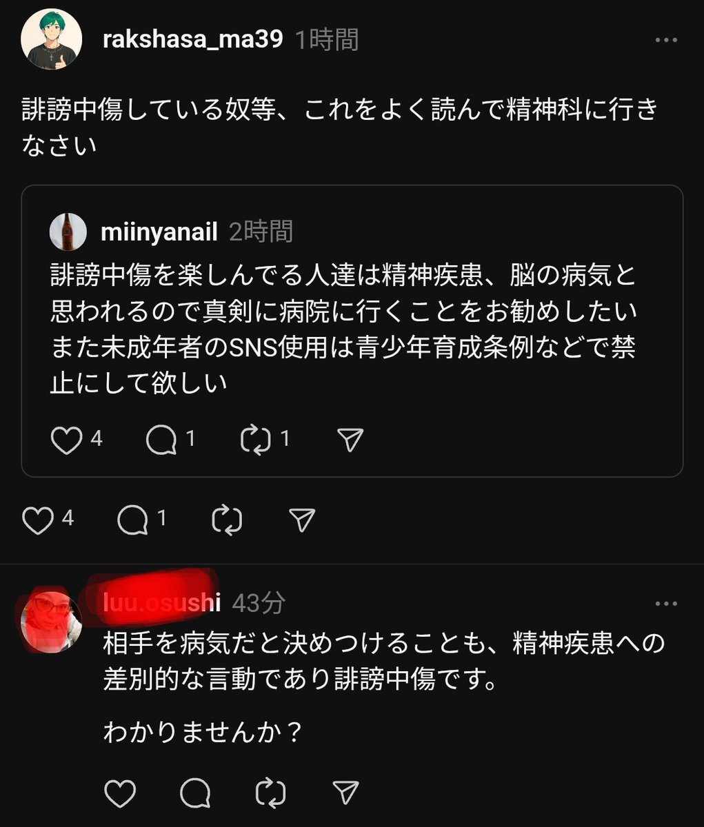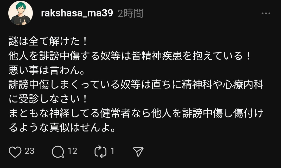精神疾患への差別です。 いいコメントだ。 小山メンタルクリニックにて「誹謗中傷してしまうのですが…」って相談してみたら? #南斗零 #柏渕理樹 #小山メンタルクリニック #精神疾患 #差別 #誹謗中傷 pic.x.com/EFJmxrEYlP