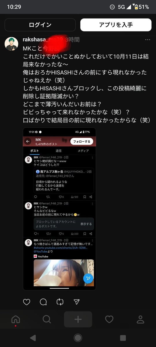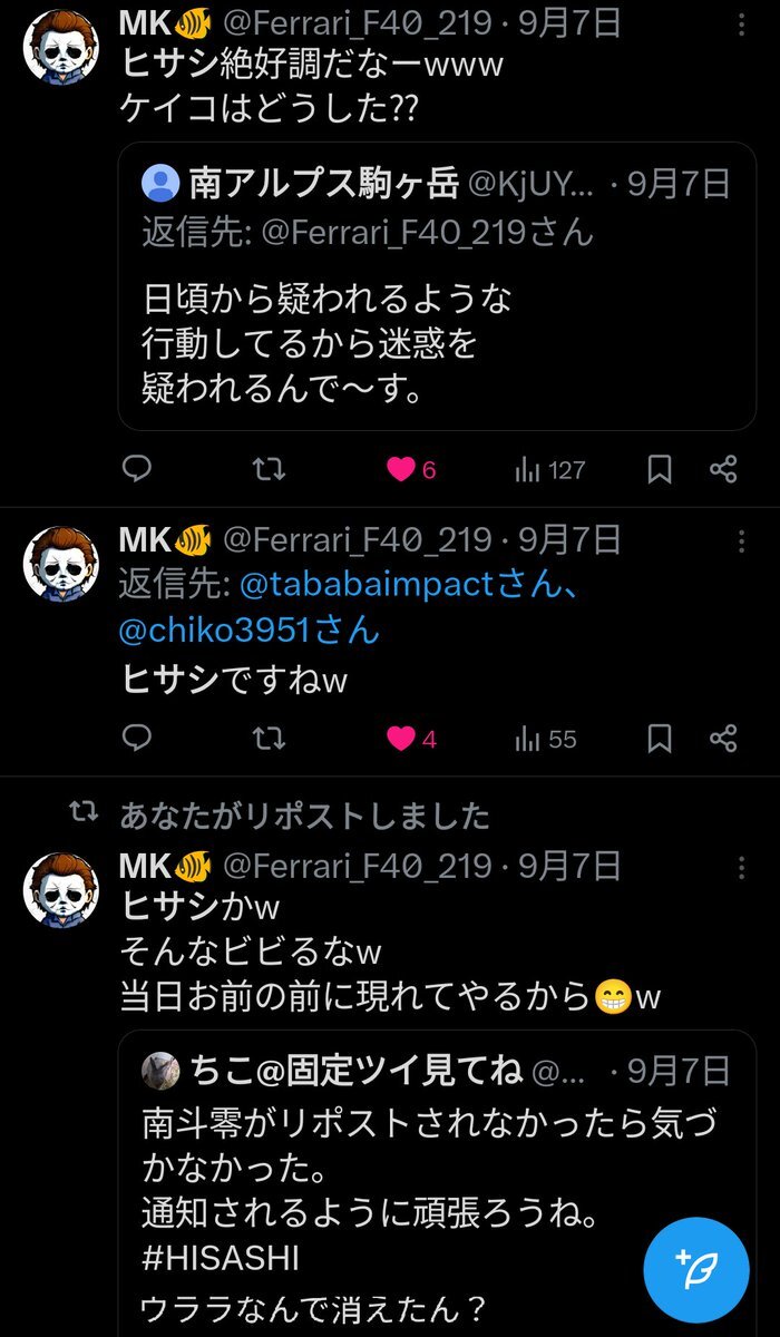 MKさんの事が好きだね。 因みに検索したら証拠隠滅してませんでした。 なんでブロックしてるしてないって知ってるの? 柏渕くんがHISASHIなの? #南斗零 #柏渕理樹 #HISASHI pic.x.com/HQRIUXj6O7