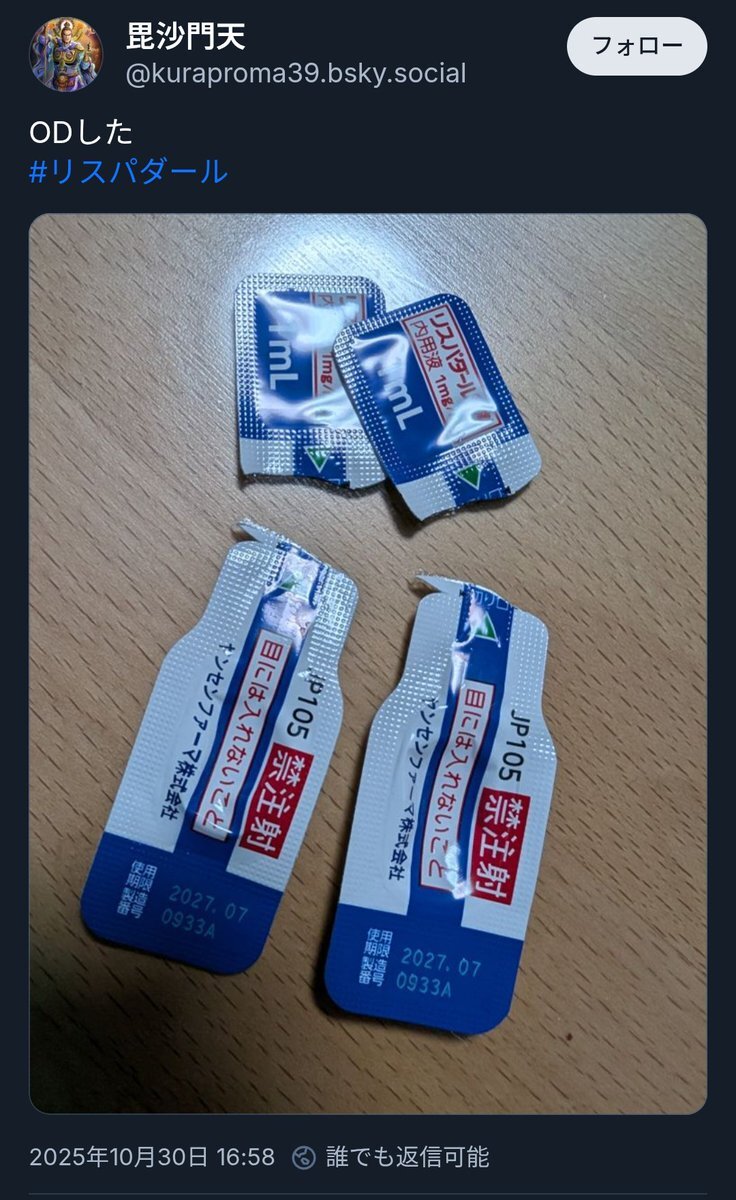 入院したらどうだろうか? 小山メンタルクリニックで『ODした事をSNSに投稿しました。入院させてください』って相談してください。 #南斗零 #柏渕理樹 #ODはかまってちゃんだと思ってる精神疾患持ち pic.x.com/qfILJdZb1G