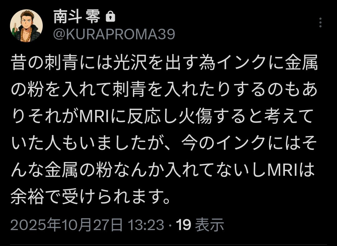 「(略)MRIは余裕で受けれます。」 昔よりリスクが低下しただけで入れ墨している人は違和感等を感じた場合は報告する事になっております。 柏渕くんは誰かに入れ墨に関して言われたんだろう? そりゃ言われるでしょうね。 でも覚悟があって入れてるんでしょ?覚悟もてよ! #南斗零 #柏渕理樹 #MRI pic.x.com/RZ4Purtr9V