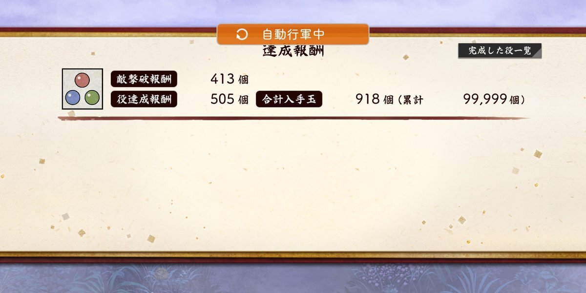 日光さん・実休さんは確定報酬もパネル出現分も全回収。 鵜飼派コンビはパネル出現分全く出てこなかった…。現場多かったし、有志たちが上げてるシルエット一覧見比べで画面注視しなきゃいないから進みが悪くて、確定は30万の雲次さん入手ならず。最終的にあと5万くらい足りなかった。 #柚子本丸日記 pic.x.com/RI4gz03wpW