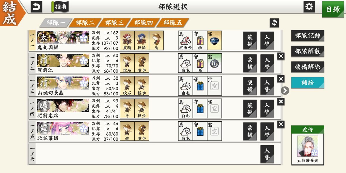 編成は自動周回やりやすいと見かけた、育てたい子(楽器兵)+極短刀4で回ってた。 北谷菜切だけ最初から最後まで固定で入れてて、他のメンバーはたまに入れ替えた有り。 少しレベル差のある北谷菜切だけよく橙疲労なってたけど、確かに放置周回しやすかった。 #柚子本丸日記 pic.x.com/XSvECSSgTC