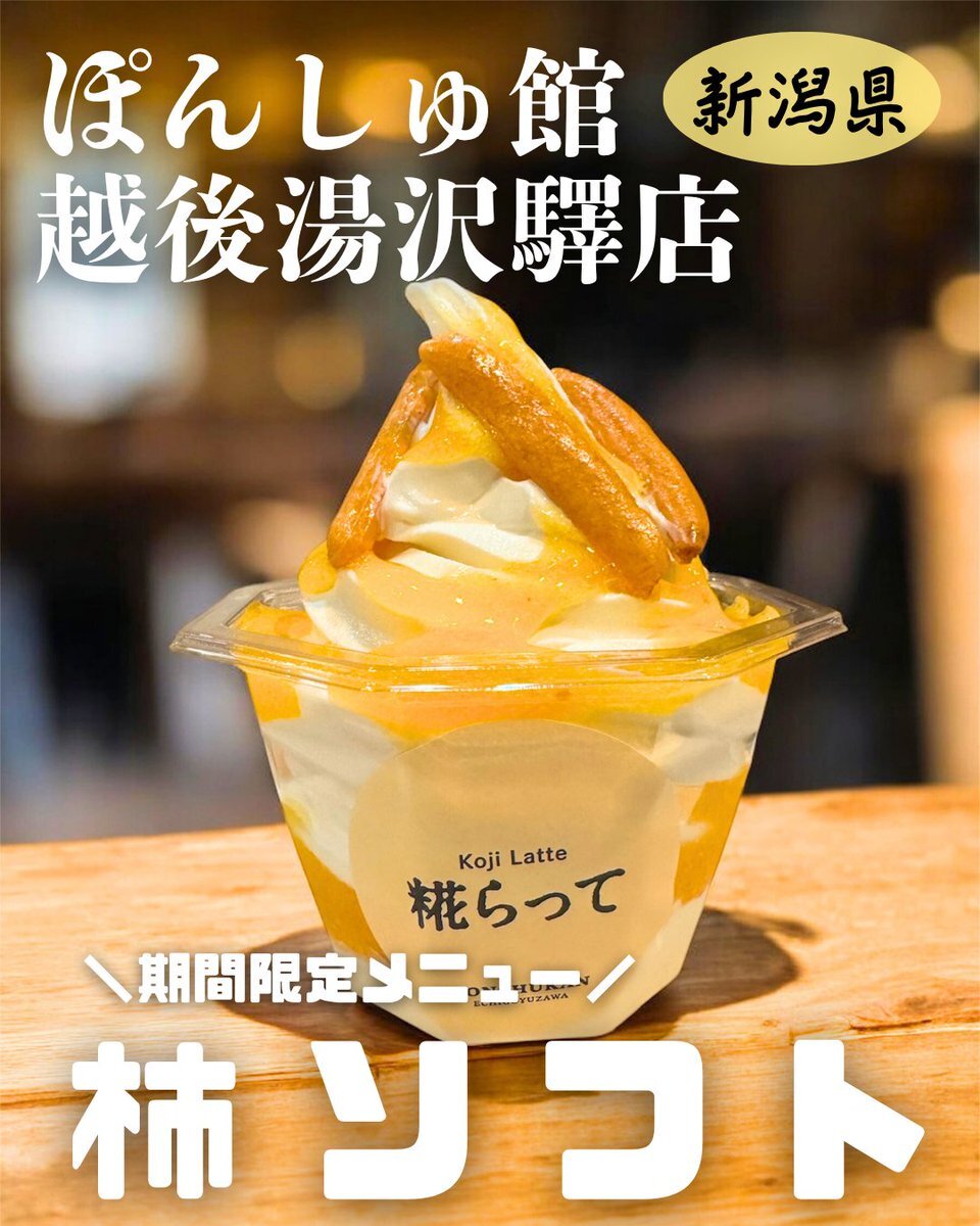 \期間限定/ ━━━━━ 柿ソフト ━━━━━ この時期の旬の柿♡ 100%のそのまんま柿ソースをたっぷり使用✨ 浪花屋製菓さんの「大粒柿の種」をトッピング♪ この時期にしか味わえないメニューです!♡ #柿の種 #浪花屋製菓 #越後湯沢 pic.x.com/lfeG4QyXzw
