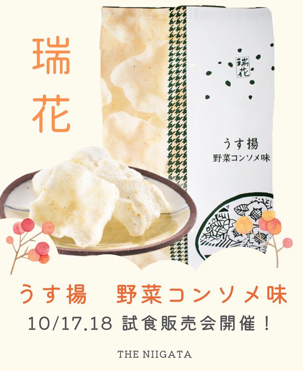 《瑞花 うす揚野菜コンソメ味試食販売会開催!😋》 こんにちは♩THE NIIGATA物販ショップです✨ 10/17〜18の2日間、軽やかな食感が人気のおせんべい、うす揚の季節限定フレーバー「野菜コンソメ味」の試食販売会を開催いたします💁♀️ ◎うす揚について