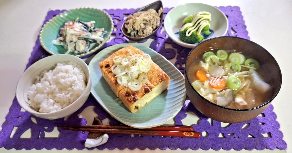 けんちん汁 栃尾揚げ ブロッコリー わらびのサラダ たらのこいり ご飯 #晩ごはん #けんちん汁 #栃尾揚げ pic.x.com/k1bKVe2QEH