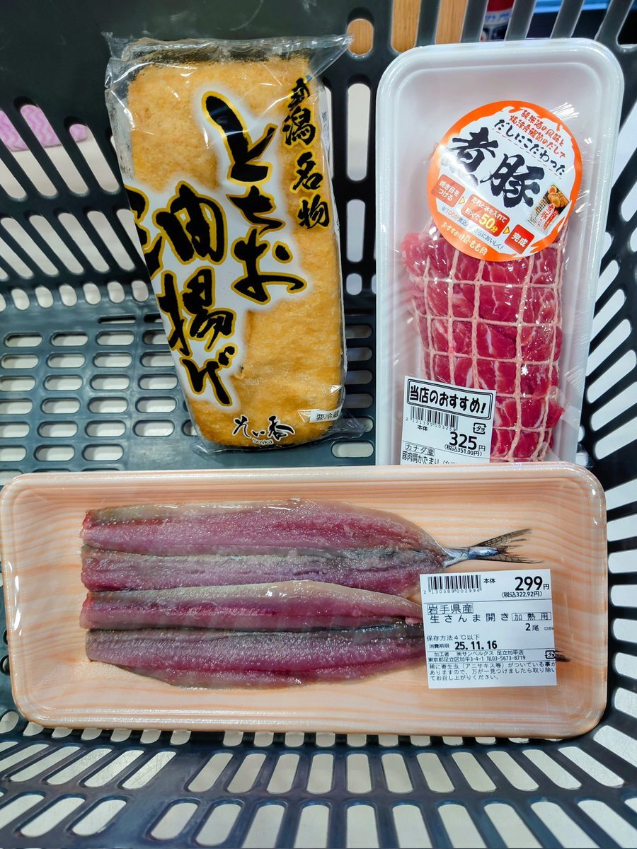 お買い物お買い物IMA😂!? これで明日のジジ弁なにしましょ😂!? 綺麗に開いた秋刀魚が売っていたので、つい手にしてしまったけど……!? 栃尾揚げは、焼いて食べる物と思っている方が多いと思うが、おでんなどの煮物の類で食べてごらん!? 本当に美味しいよMAJI😂!? #ジジ弁 #栃尾揚げ pic.x.com/Z4ZEKd19yP