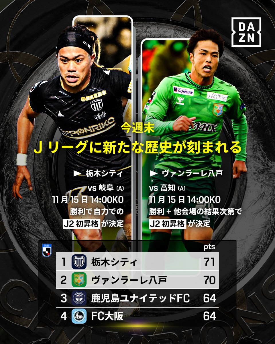 ◥◣Jリーグに新たな歴史が刻まれる‼️◢◤ 参入初年度から快進撃を続け3年連続の昇格を狙う #栃木C 🌟 #八戸 は2019年にJ3に昇格以降、史上初のJ2昇格を決めるか✨ 🏆明治安田J3リーグ第36節 🆚岐阜×栃木C/高知×八戸 📅11/15(土)🕑14:00 📱#DAZN ライブ配信 #Jみようぜ #Jリーグ #だったらDAZN