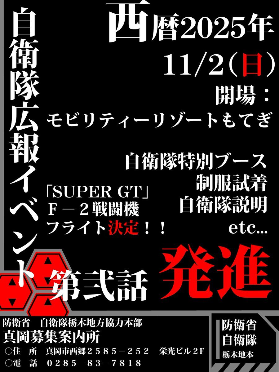 11月2日(日) モビリティリゾートもてぎで行われるSUPER GTで自衛隊広報イベント開催☆ 制服試着・自衛隊の各種説明など特別なブースに加え、 「SUPER GT」×F-2戦闘機フライト決定((o(*゚∀゚*)o)) ――轟音を体感せよ! ※有料エリアへは入場チケットをお持ちの方のみが入場できます #栃木地本 pic.x.com/RAivFwQH2T