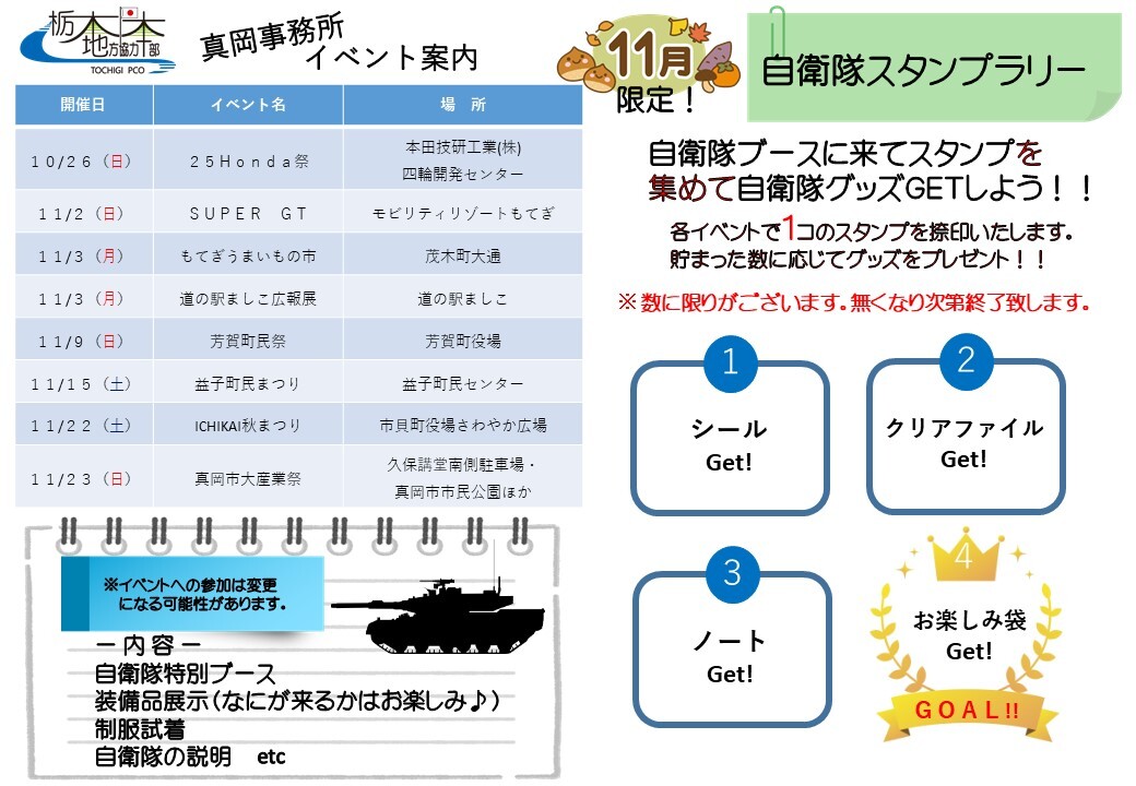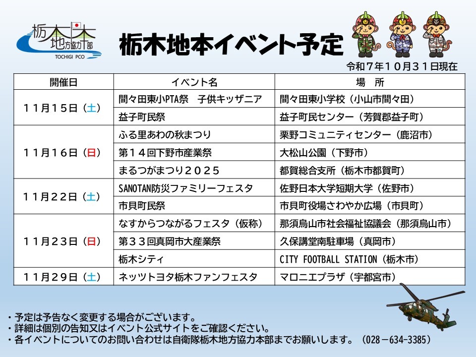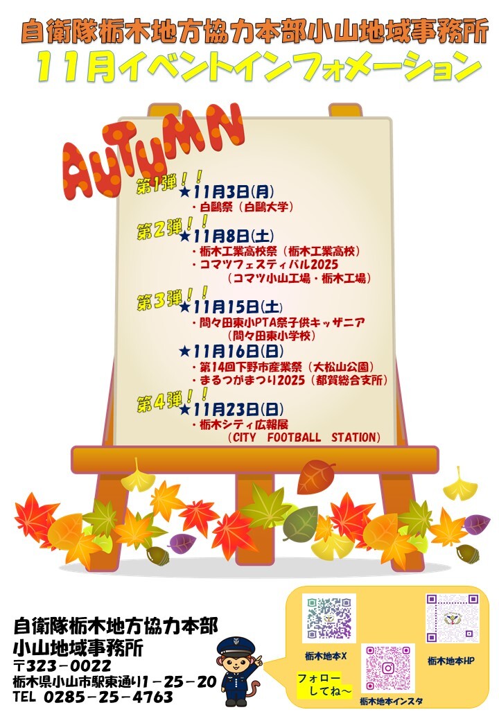 【イベント情報】 11月15日以降のイベント情報一覧です(・ω・) 詳細な開催時間などは イベント公式サイト又は地本HPの個別の告知等をご確認くださいm(__)m #栃木地本 #自衛隊 #イベント情報 pic.x.com/Xzg8rwpIzt