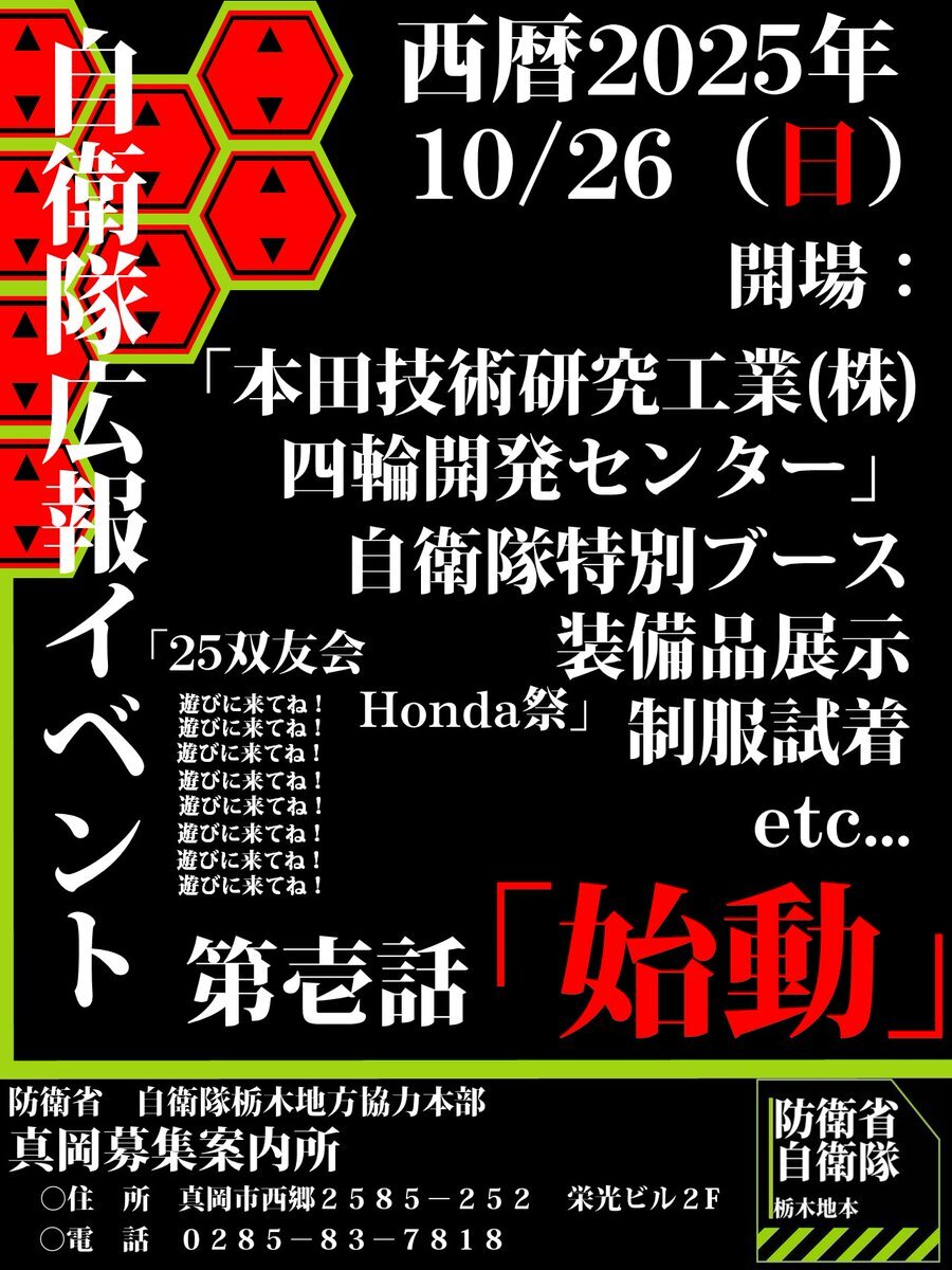 10月26日(日) 本田技研工業(株)四輪開発センターにて開催される25双友会Honda祭に自衛隊広報ブースを出展☆ 装備品展示・制服試着など魅力ある特別ブースを展開します! 見て、触れて、体感せよ――(〃・ิv・ิ)ゞ #栃木地本 #自衛隊 #イベント情報 #真岡地域事務所