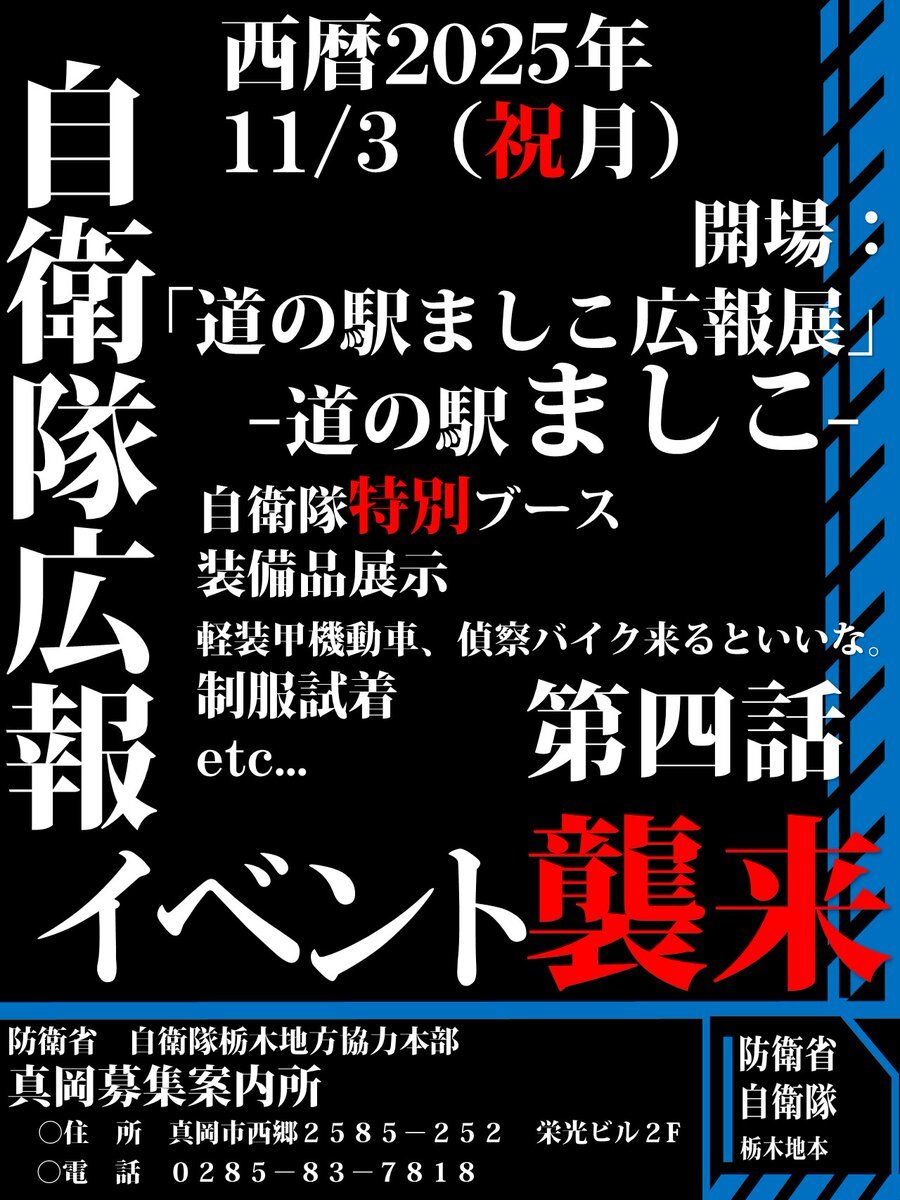 11月3日(祝・月) もてぎうまいもの市(茂木町大通)にて 自衛隊広報イベント開催! 制服試着・自衛官による説明など盛り沢山☆ もちろん自衛隊車両の展示も予定!何が来るかは当日のお楽しみ(人´エ`*)♪ ――道の駅ましこでもイベント開催!! スタンプ集めてグッズをGET☆ #栃木地本 #自衛隊