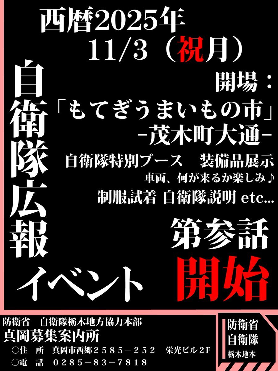 11/3は もてぎうまいもの市(茂木町大通)にて 自衛隊広報イベント🪖 #防衛省 #自衛隊 #自衛官募集 #栃木地本 pic.x.com/2KnesTVGy1 x.com/tochigi_pco/st…