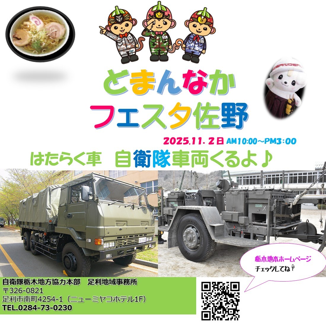 今年もやってきました 令和7年11月2日(日)開催 #どまんなかフェスタ佐野 はたらく車イベントに 自衛隊車両 3.5トントラック、炊事車が来ます! 普段見ることができない自衛隊車両 是非この機会に見て触れて体験してみてね 皆様のご来場をお待ちしておりまする #自衛隊 #足利市