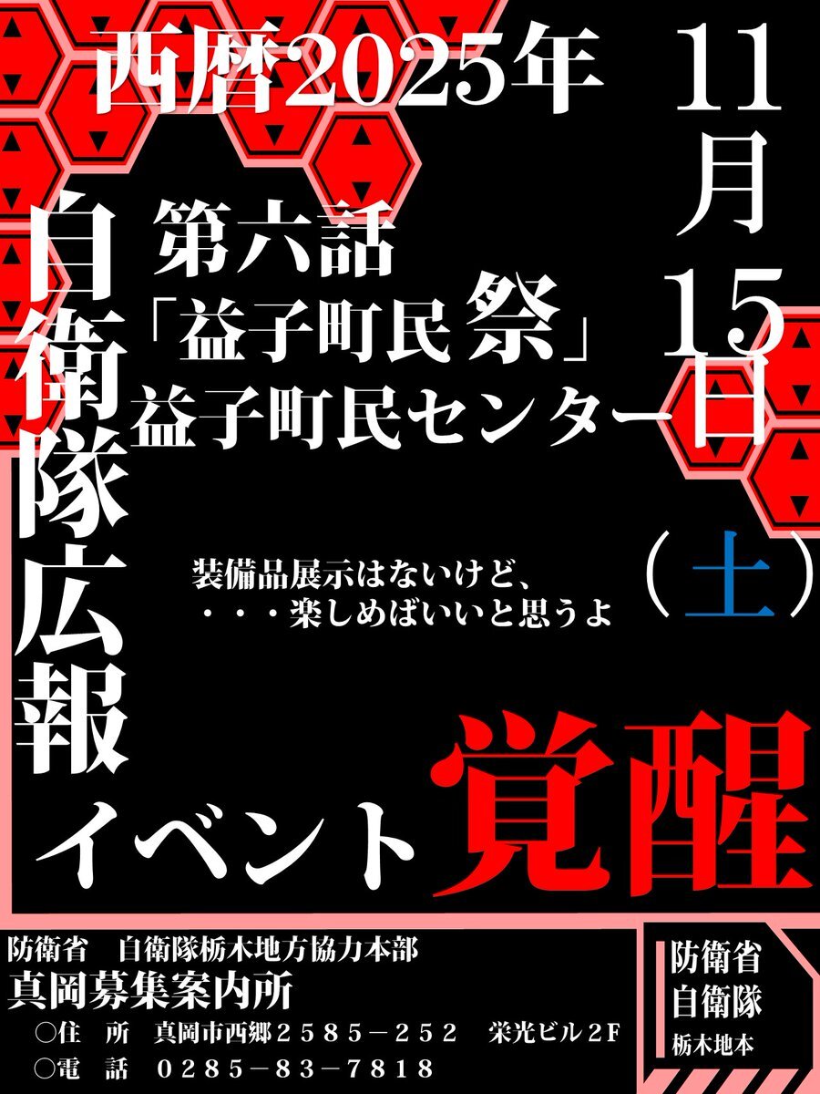 11月15日(土) 益子町民センターにて益子町民まつり開催! 制服試着&自衛隊の各種説明などの楽しめる体験ブースを設置します(^_-)-☆ (※装備品展示はありません)(@_@;)ゴニョゴニョ ――遊びに来て下さぁ~い!! #栃木地本 #自衛隊 #真岡地域事務所 pic.x.com/jQ5SveV0kJ