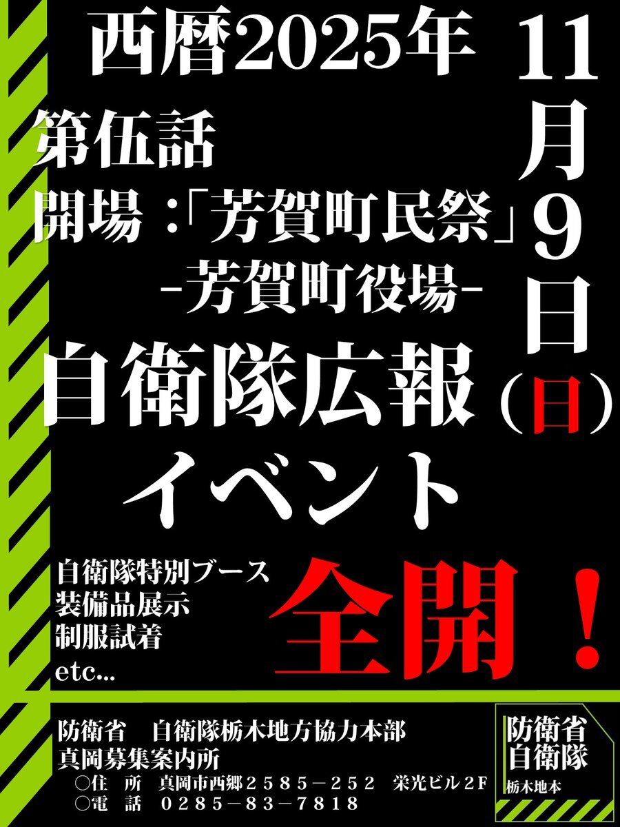 11月9日(日) 芳賀町役場にて芳賀町民祭開催! 自衛隊広報ブースを出展します ( ^-^)ノ∠※.:*:・'°☆ 装備品展示・制服試着・説明コーナーなど、自衛隊を満喫しましょー♪ ――地域の方々とともに盛り上げますp(^-^)q #栃木地本 #自衛隊 #真岡地域事務所 pic.x.com/FsiTOxbnTh