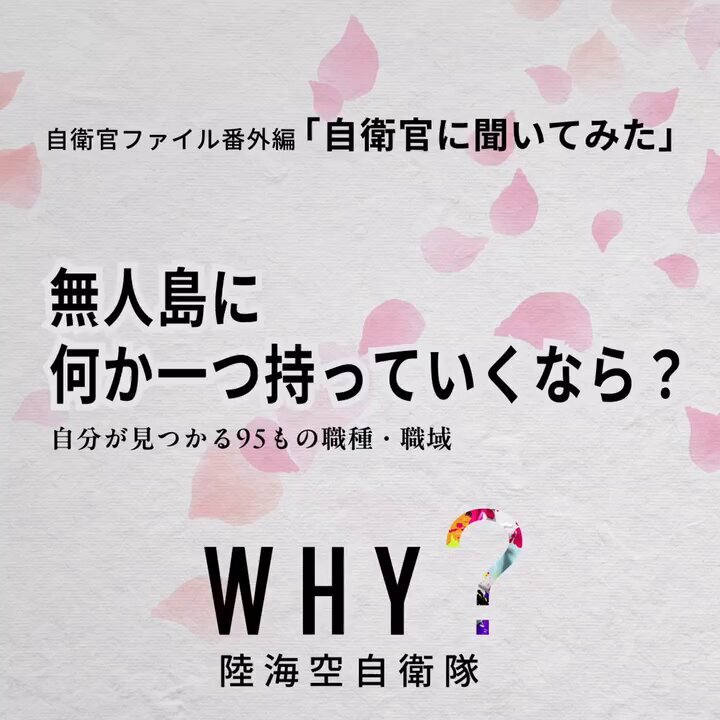 「#自衛官ファイル」「番外編」 またもや自衛官ファイルにてここまでに登場した12名の自衛官に「無人島に何か一つ持っていくなら?🏝️」を聞いてみました! 前回の12名は文字通り多彩(笑)な答えが飛び交いましたが果たして今回は?? #陸上自衛官 #海上自衛官 #航空自衛官 #防衛省・自衛隊