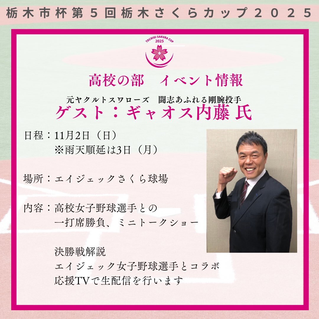 #栃木市杯第5回栃木さくらカップ2025 高校の部 イベント情報 明日はエイジェックさくら球場で沢山のイベントがあります🎶 それぞれのイベントの詳細は各画像をご覧ください💨 是非球場に来てお楽しみください🎀 🗓️11月2(日) 🏟️エイジェックさくら球場 #栃木さくらカップ2025 #女子野球 #栃木市 pic.x.com/6NsKGmFsi5