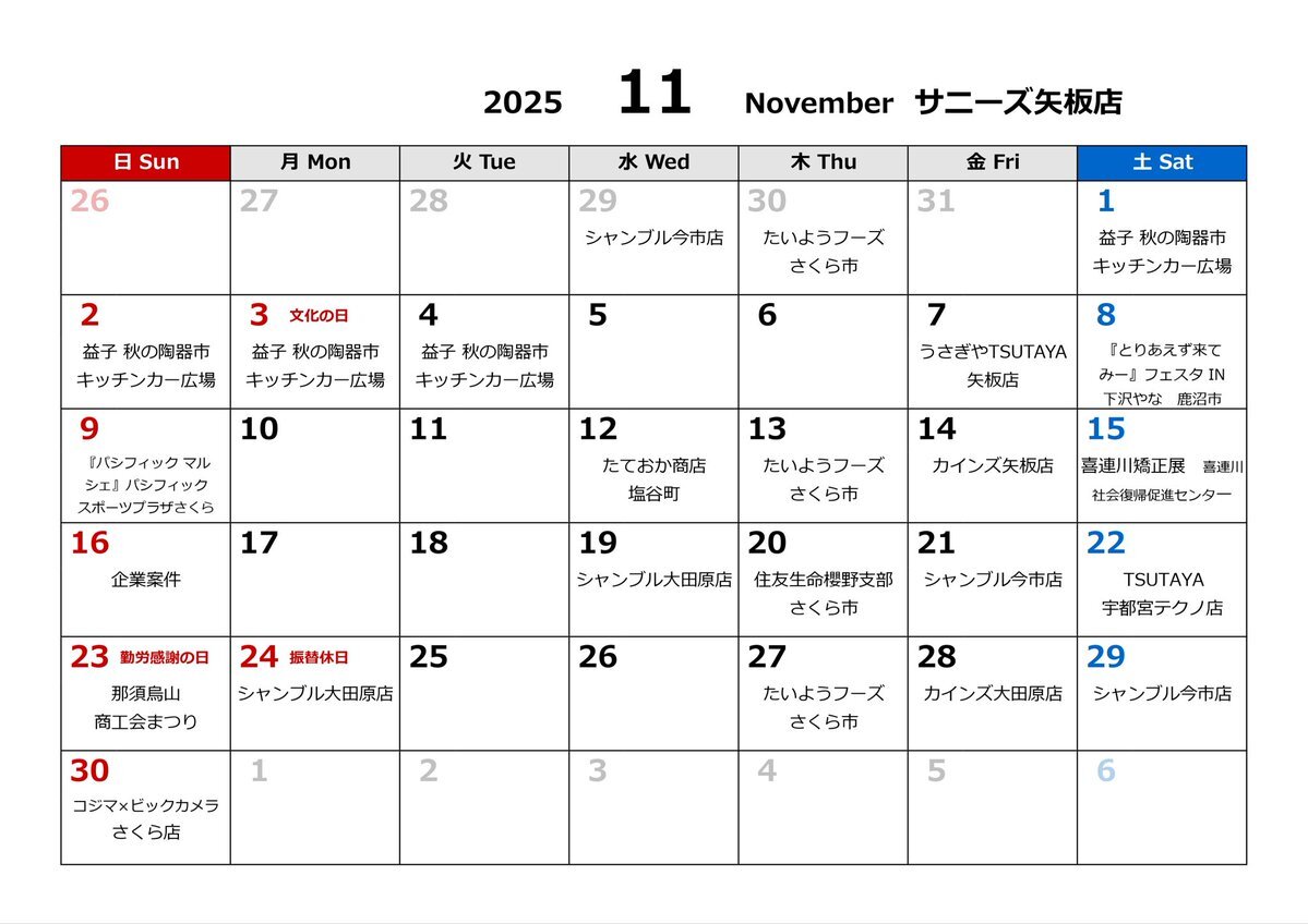 11月の出店予定です✨ 1日〜4日は、益子陶器市 14日(金)は、カインズ矢板店 28日(金)は、カインズ大田原店に初出店 変更があった場合には、随時お知らせ致します🙇‍♂️ #栃木県キッチンカー #栃木県クレープ #栃木県移動販売 #サニーズ #サニーズクレープ #サニーズ矢板店 pic.x.com/7Nc0Tdamzi