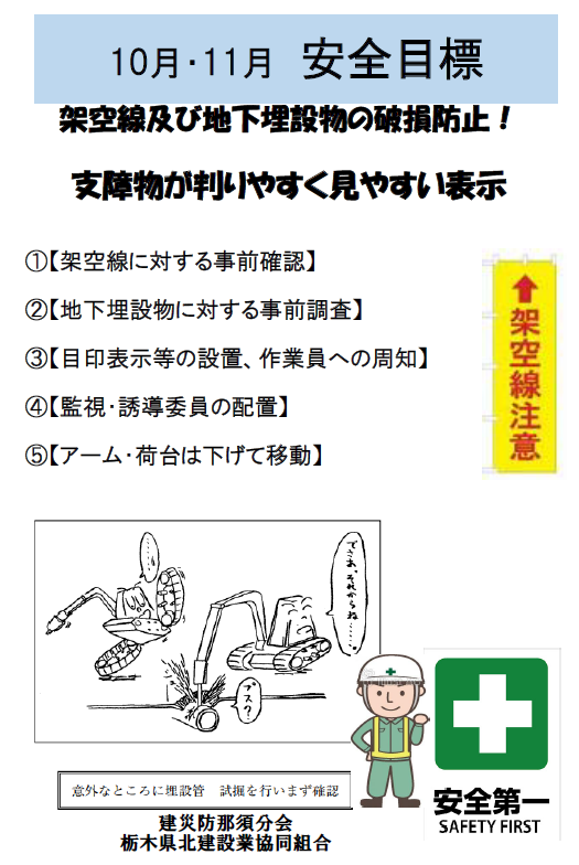 #那須支部 からのお知らせ \ 10月・11月安全目標(架空線・地下埋設物) tochiken-nasu.jp/10%e6%9c%88%e3… #栃木県建設業協会 pic.x.com/dcpizT5pKK