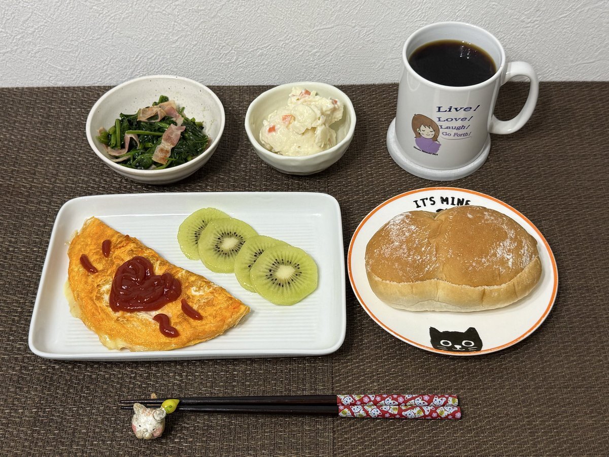 朝ごパン🥖 「上州みそパン」 「ひろのブレンド」 「チーズオムレツ」 「ポテトサラダ」 「ほうれん草のソテー」 「キウイフルーツ」 #第一屋製パン #上州みそパン #行田市 #まめや忍 #ひろのブレンド #潮崎ひろの #深谷市 #田中農場 #宝玉卵 #栃木県産🥬 #NZ産🇳🇿🥝 pic.x.com/VwphefemAX