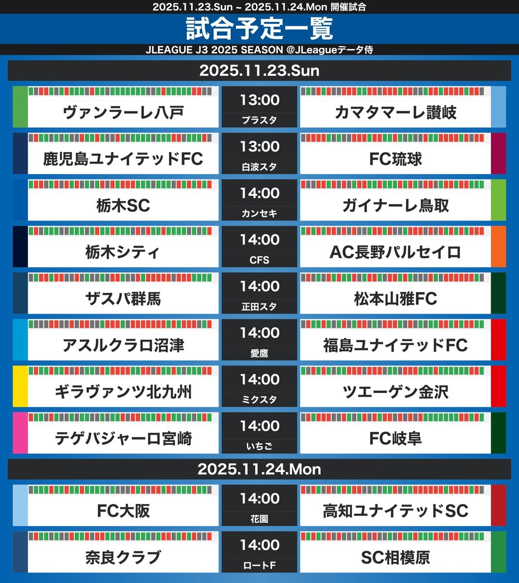 (0/10) 🗓️2025.11.23.Sun ~ 2025.11.24.Mon J3リーグ 試合一覧 ⬇️⬇️ ツリーに試合ごとのデータ ⬇️⬇️ #Jリーグ #八戸讃岐 #鹿児島琉球 #栃木SC鳥取 #栃木C長野 #群馬松本 #沼津福島 #北九州金沢 #宮崎岐阜 #FC大阪高知 #奈良相模原 pic.x.com/lL44EYUFJn