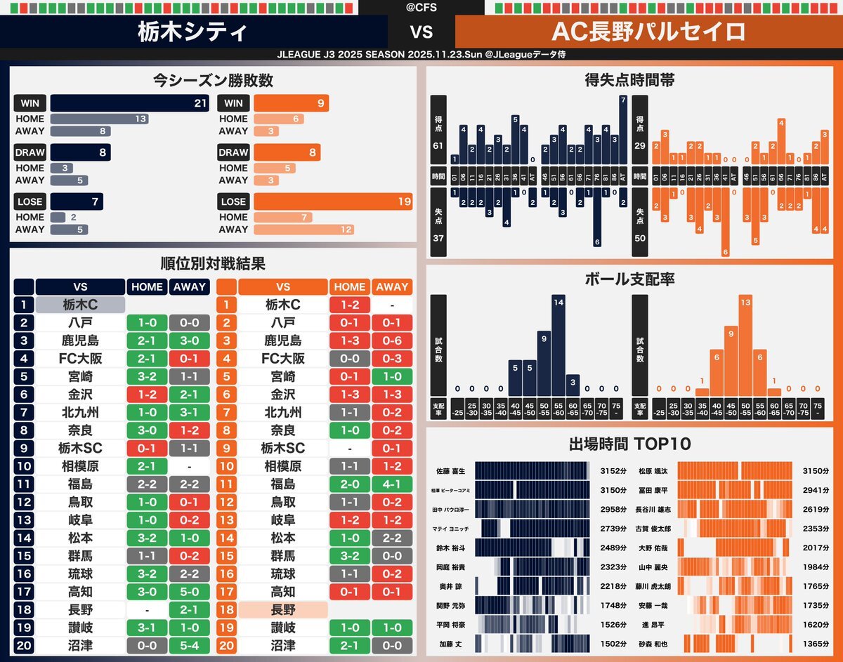 (04/10) 🗓️2025年11月23日(Sun) J3 試合プレビュー画像📊 ➡︎試合前に対戦相手のデータをチェック👀 栃木シティ vs AC長野パルセイロ #Jリーグ #栃木C長野 pic.x.com/cNjLZq8P5o