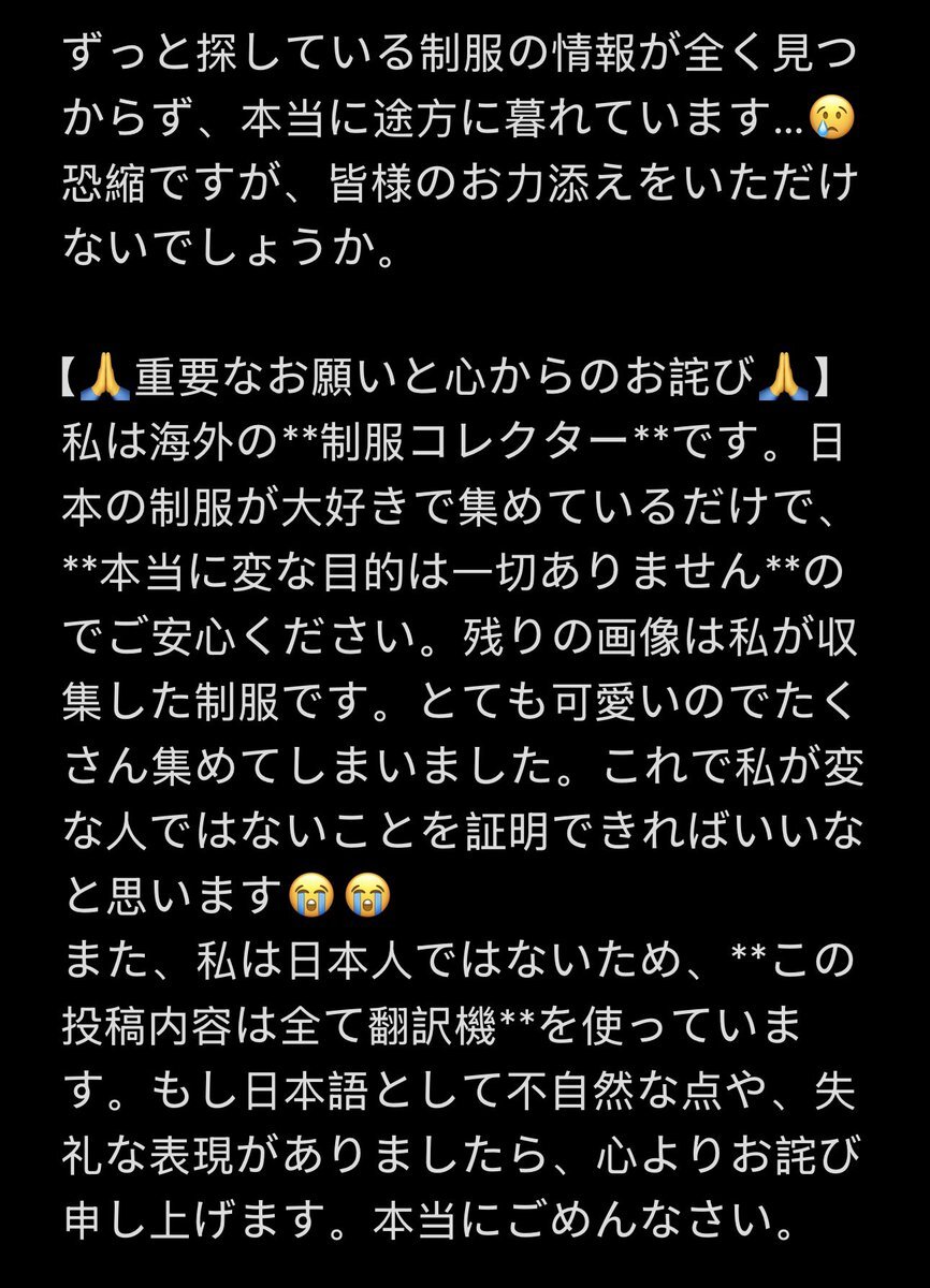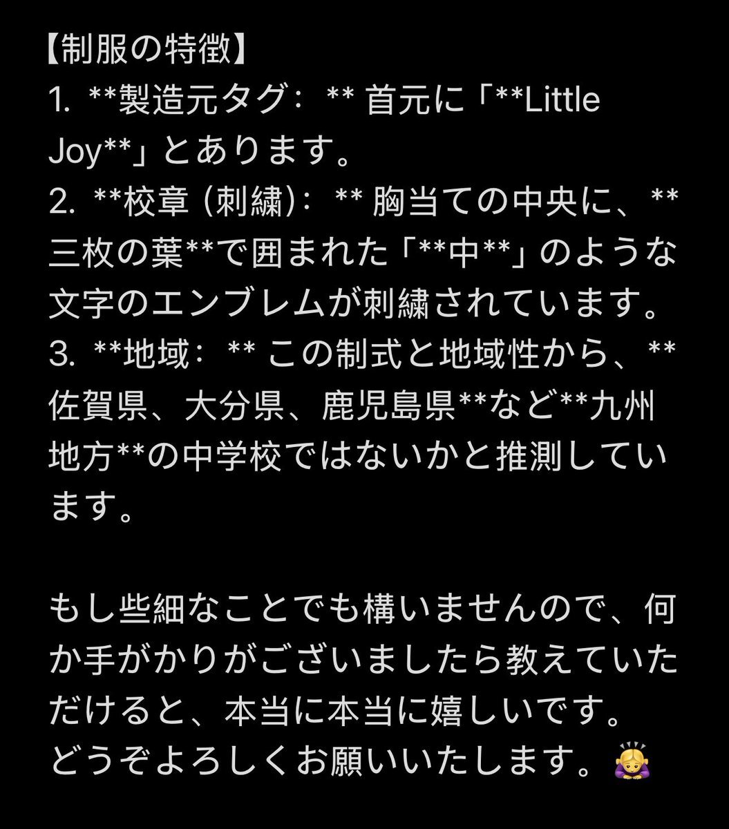 ⚠️制服情報探しています🙏 海外のコレクターです。日本の制服が好きで集めています。(変な目的はありません!) この制服の情報が全く見つからず、困っています。翻訳機使用で失礼があればごめんなさい。🙇‍♀️🙏 詳しくは写真をご覧ください!🙇‍♀️🙏 #セーラー服 #制服マニア #校章 #中学校 #LittleJoy pic.x.com/bX4fW6NUAO