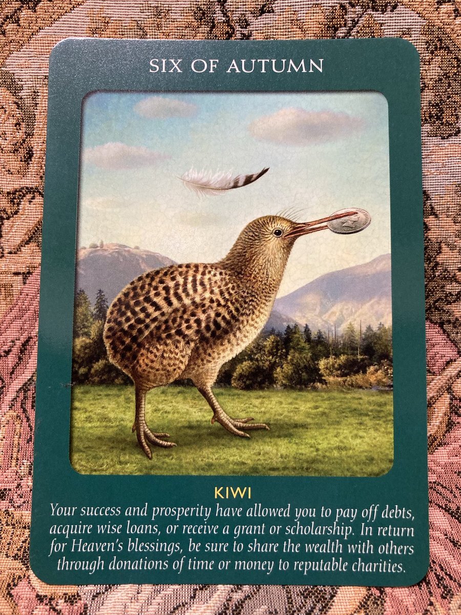 このカードが目についたアナタへのメッセージです。 秋の6 キーウィ 経済面での安心感、融資を受ける、負債を完済する、金銭という形での贈り物。 今は困っている人達に分け与える時です♪ #ANIMAL TAROT CARDS #ドリーン•バーチュー&ラドリー•バレンタイン #株式会社JMA•アソシエイツ pic.x.com/uyFXkDk1VB