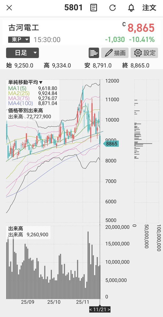 【日経225 株価アラート - 2025年11月23日 21:27時点】 (3/7) 【📉 急落】 Furukawa Electric Co., Ltd. (5801) 9,895円 → 8,865円 (-1,030円) 前日比: -10.41% 【📉 急落】 Sumitomo Electric Industries, Ltd. (5802) 6,388円 → 5,698円 (-690円) 前日比: -10.80% #株式投資 #日経225 #急騰株