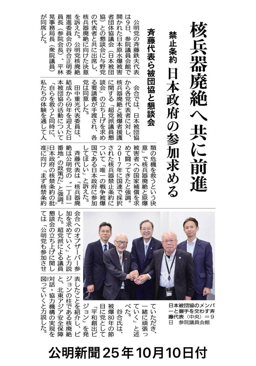 核兵器廃絶に関する超党派議員懇談会が設立されることになりました。 (公明新聞10月10日付)会合では、日本被団協から各党代表者に対し、核兵器廃絶と被爆者援護に関する「超党派議員懇談会」の立ち上げを求める要請書が手渡され、各党は同意した。 #公明党 #核廃絶