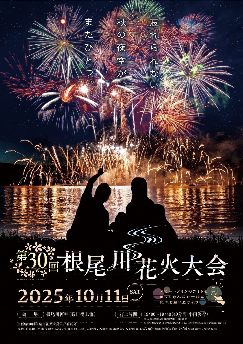 第30回根尾川花火大会 10月11日(土) 午後7時00分から7時40分       ※小雨決行 打ち上げの出来ない場合 翌日12日(日) 大野町HP town-ono.jp/0000002094.html ※注釈※ 雨天時の案内 本巣市HPにも記載あり #根尾川花火大会 #大野町 #本巣市 #薮川橋 #根尾川 pic.x.com/4yyy963rA2 x.com/_ogaki_/status…