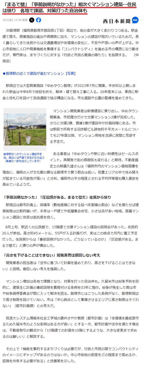 「まるで壁」「事前説明がなかった」相次ぐマンション建築…住民は憤り 各地で課題、対策打った自治体も 2025/10/3 news.yahoo.co.jp/articles/fcf98… #貧困 #貧困問題 #増税 #格差 #格差社会 #物価高 #インフレ #少子化 #少子高齢化 #アベノミクス pic.x.com/tHpIXkERN4