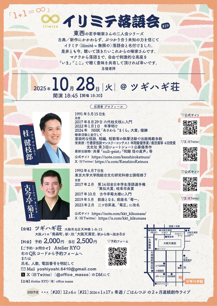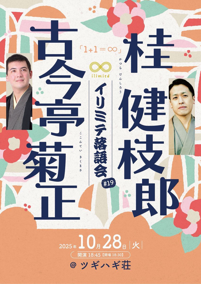 《❤️🔥拡散RP希望❤️🔥》 10月28(火) イリミテ落語会#19 ツギハギ荘 開演18:45 #桂健枝郎 / #古今亭菊正 同期のシュッ✨としたお2人 キャリア10年の節目に向けて 鋭意 猛勉強中👊🏻‼︎ 是非聴いて頂きたい東西の注目株 饒舌な落語愛トークもお楽しみに ╰(*´︶`*)╯♡ ご予約 form.run/@yoshiyoshi--1…