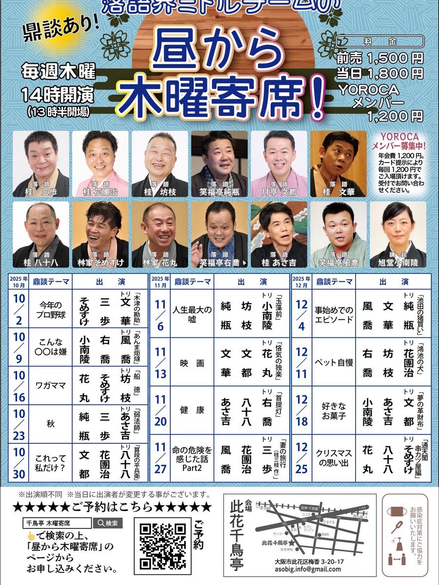明日11/6の千鳥亭・木曜寄席(14時開演)は! トリ》旭堂小南陵「玉藻前」、桂坊枝、笑福亭純瓶、予約1500円、当日1800円、YOROKAカード1200円、 申込》konohana-chidoritei.com/moku/ 此花千鳥亭》大阪市此花区梅香3-20-17 #落語 #寄席 #此花千鳥亭 #笑福亭純瓶 #旭堂小南陵 #桂坊枝 pic.x.com/aUgzxtRk7O