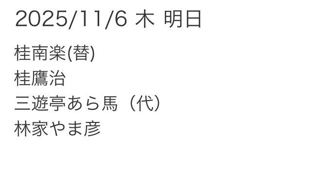 昇りん兄さんファンの方 ごめんなさい🙇♂️ 明日は連雀亭昼席あら馬代演で伺います! 兄さん!早く元気になりますように✨ 夜18時からは歴史ある【第48回せんばい寄席】 #桂宮治 #ねづっち #春本小助 #三遊亭あら馬 #桂しゅう治 ※この事務員さん担当の時は 前座の時の宣材写真なんだよな〜😅 pic.x.com/4QMEvLL6Nc x.com/syorin_gosyu/s…