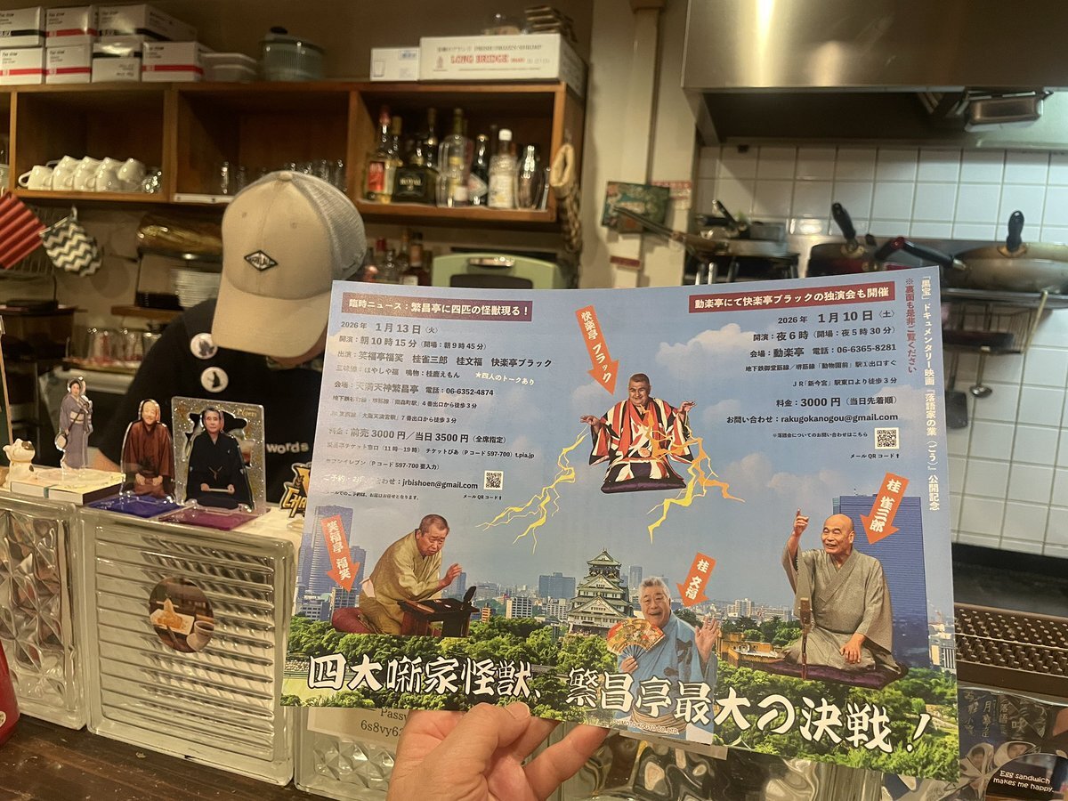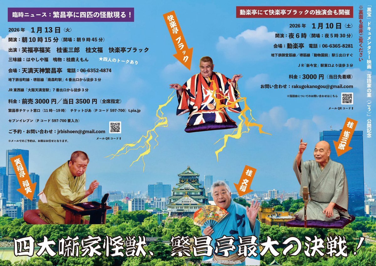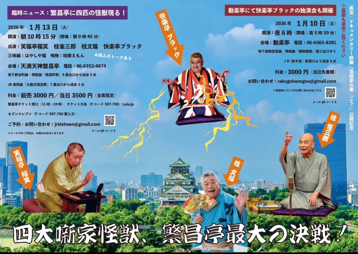 映画『落語家の業(ごう)』 公開記念in大阪 『四大噺家怪獣、繁昌亭最大の決戦!』 ⚫︎2026年1月13日(火)朝 天満天神繁昌亭 #笑福亭福笑 #桂雀三郎 #桂文福 #快楽亭ブラック 🎫好きな席をしっかり派⬇️ ◾️ぴあ t.pia.jp/pia/search_all… ◾️繁昌亭窓口 🎫サクッと取り置き派⬇️ jrbishoen@gmail.com pic.x.com/RXmDJVNReC x.com/goyachangogo/s…