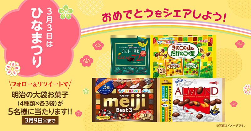 🎎3月3日は #ひな祭り🎎 女の子の健やかな成長を願って…✨ おめでとう💕もお菓子🍫もシェアしちゃおう😆 フォロー&RTで『明治の大袋お菓子』を5名様にプレゼント🎁 ■応募方法 ①@Lets_go_Yokadoをフォロー ②本投稿をRT ※2023年3月9日(木)まで ※3月下旬に当選者にDM #桃の節句 pic.x.com/qJ9GRuBUcy