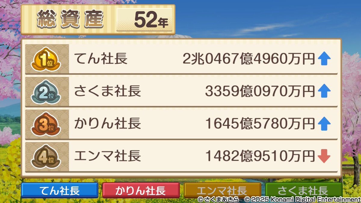 51年目終了 さくまがキングボンビーに沈められたおかげであっという間に大差をつけて2兆到達🚀 徳川家康と源義経を味方につけたらもうこのゲームはほぼやることがなくなります笑😆 #山﨑天 #藤吉夏鈴 #桃鉄 #桃太郎電鉄2 #桃鉄であの駅あの町みっけ x.com/nabepro_baken/…