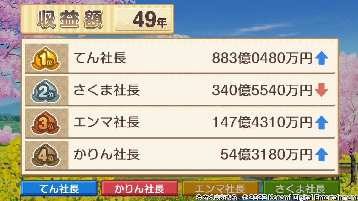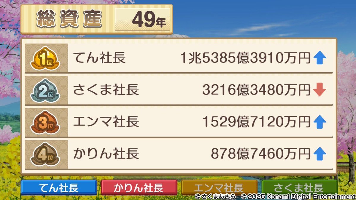 51年目終了 さくまがキングボンビーに沈められたおかげであっという間に大差をつけて2兆到達🚀 徳川家康と源義経を味方につけたらもうこのゲームはほぼやることがなくなります笑😆 #山﨑天 #藤吉夏鈴 #桃鉄 #桃太郎電鉄2 #桃鉄であの駅あの町みっけ pic.x.com/nXnK1NGg0X x.com/nabepro_baken/…