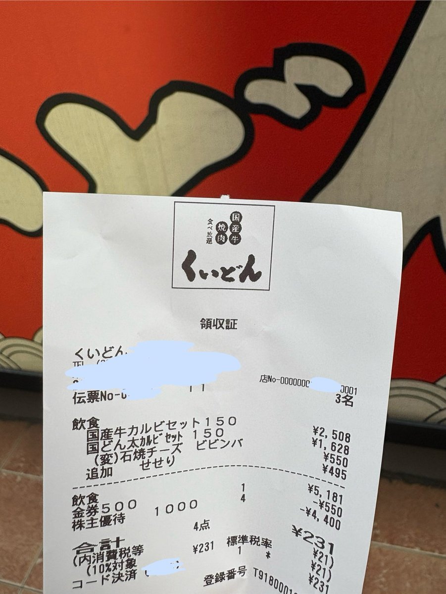 優待で焼肉食べてきました☺️ 5118円のお会計で 優待とクーポン利用して231円のお支払い! 最近は月に1回以上優待で焼肉食べてる気がします🍖 #株主優待 #優待生活 #優待クロス #株式投資 #投資家さんと繋がりたい #桐谷さん pic.x.com/L2VGISPqjF