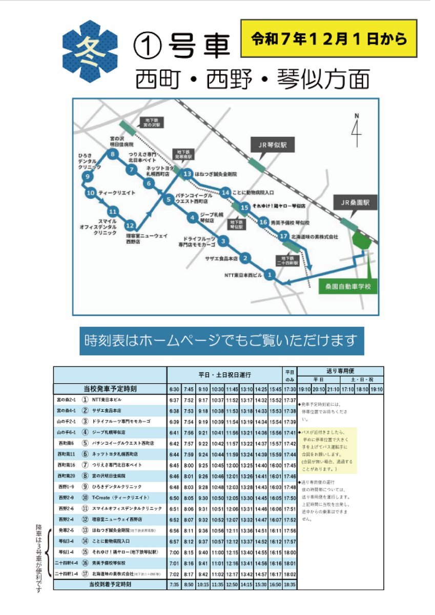 送迎バス冬ダイヤをHP上に公開しました。 改正は12月1日(月)からです。 soen-drivingschool.co.jp/entrance/bus/ 各号車のページ内上部(夏ダイヤ時刻表の上)に 掲載しておりますのでご確認ください。 #桑園自動車学校 #冬ダイヤ pic.x.com/4EA2W2shuM