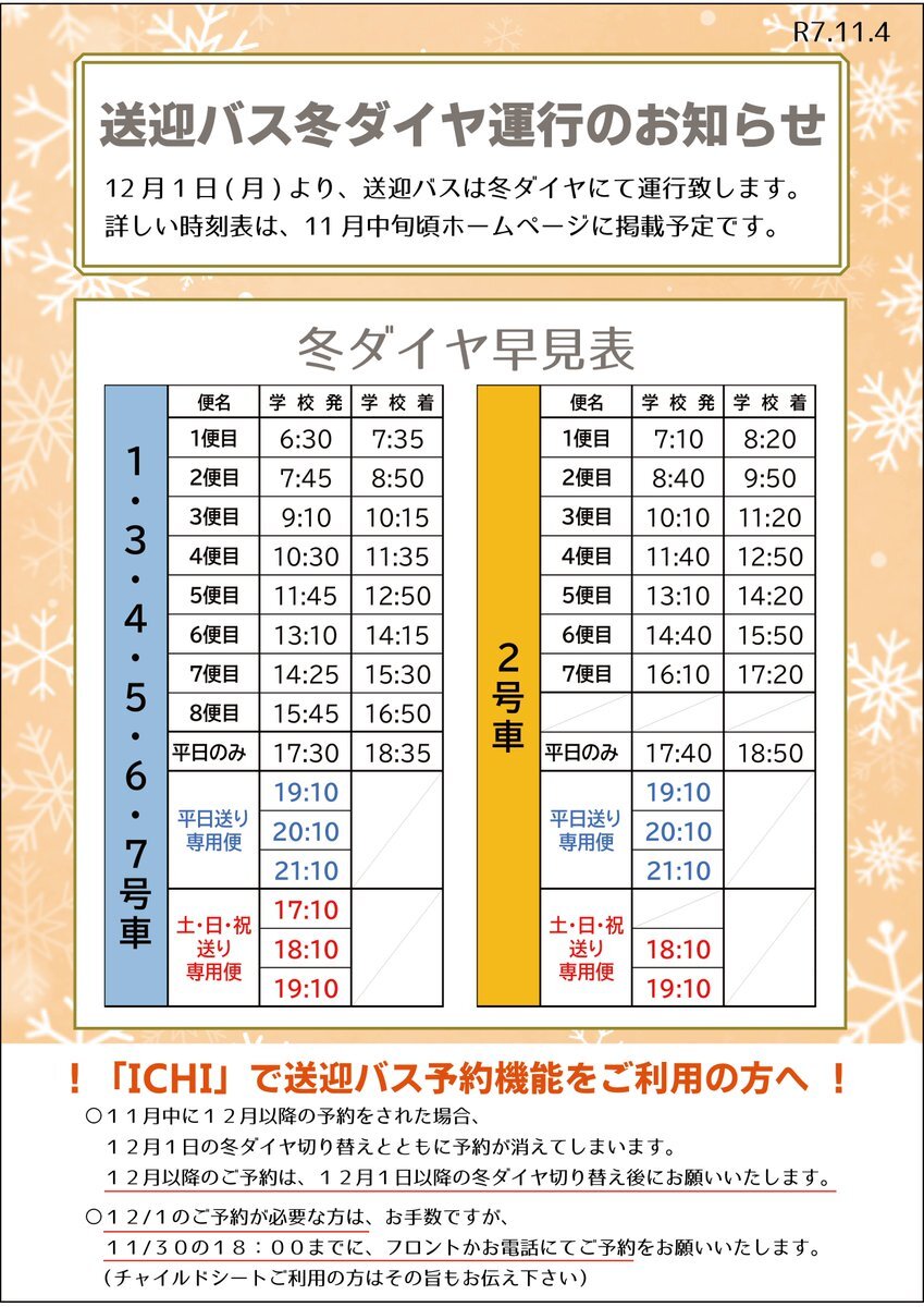 【12月1日(月)から送迎バス冬ダイヤに切り替わります】 詳しい時刻表は11月中旬頃HPに掲載予定です。 「ICHI」で送迎バスを予約されている方は、 画像に記載の通り、 12月1日の冬ダイヤ切り替え時にはご注意ください。 お手数をおかけ致しますが、何卒よろしくお願い致します。 #桑園自動車学校 pic.x.com/449XYpd9Uo
