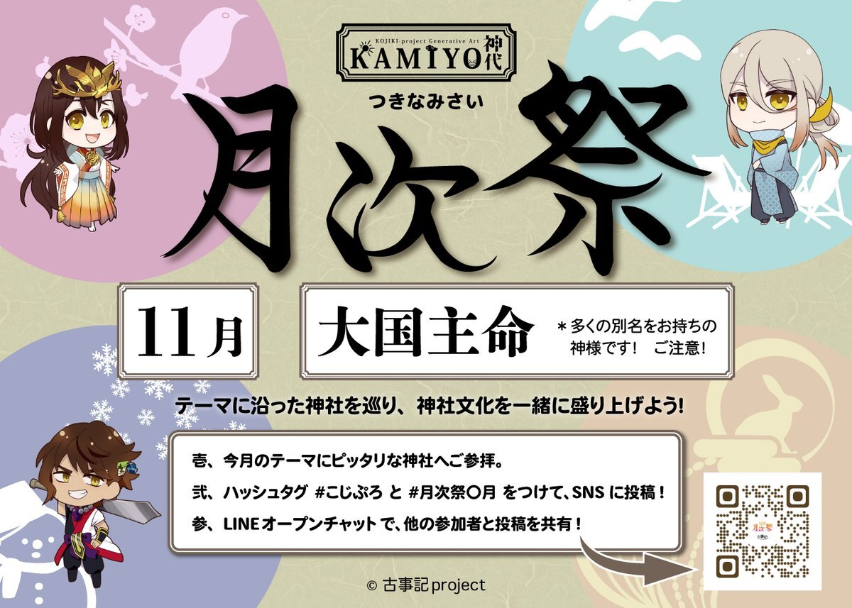 神さまと地域と仲間とご縁を結ぶ月イチ巡礼      【こじぷろ月次祭】 ◤ ̄ ̄ ̄ ̄ ̄ ̄ ̄ ̄ ̄ ̄ ̄ ̄ ̄ ̄ ̄ ̄ ̄◥  #こじぷろ #月次祭11月 のテーマは ⛩️大国主命(オオクニヌシノミコト)⛩️ ◣_________________◢ 出雲大社の「神在祭(かみありさい)」にちなんで、 “縁結び”