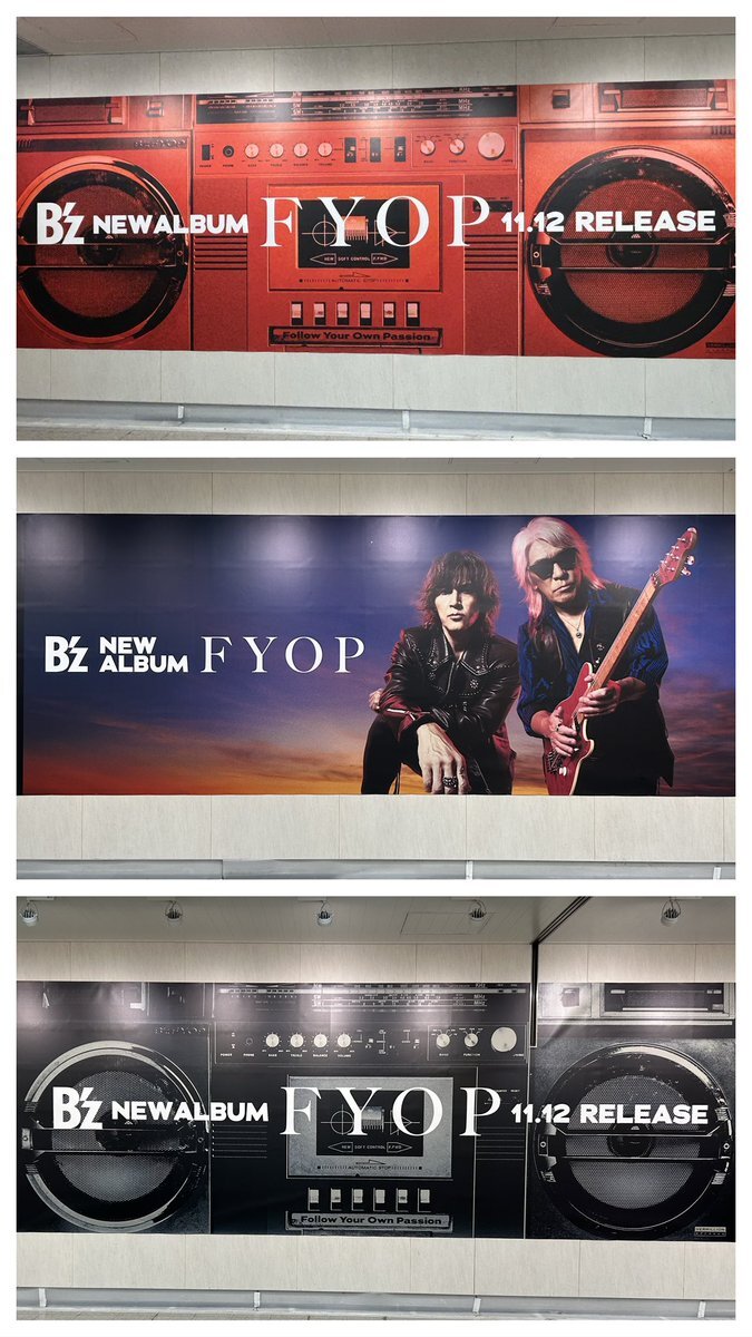【#Bz #FYOP NEWS】 B’z ALBUM「FYOP」 大阪・福岡にて大型ボード掲出! ■ JR大阪駅桜橋アベニューフル 掲出期間:11/10 (月) 〜 11/16 (日) 掲出場所:桜橋地下通路東壁面 ■ JR九州博多駅BIGエンタメ!ボード 掲出期間:11/10 (月) 〜 11/16 (日) 掲出場所:JR博多駅改札外サブコンコース